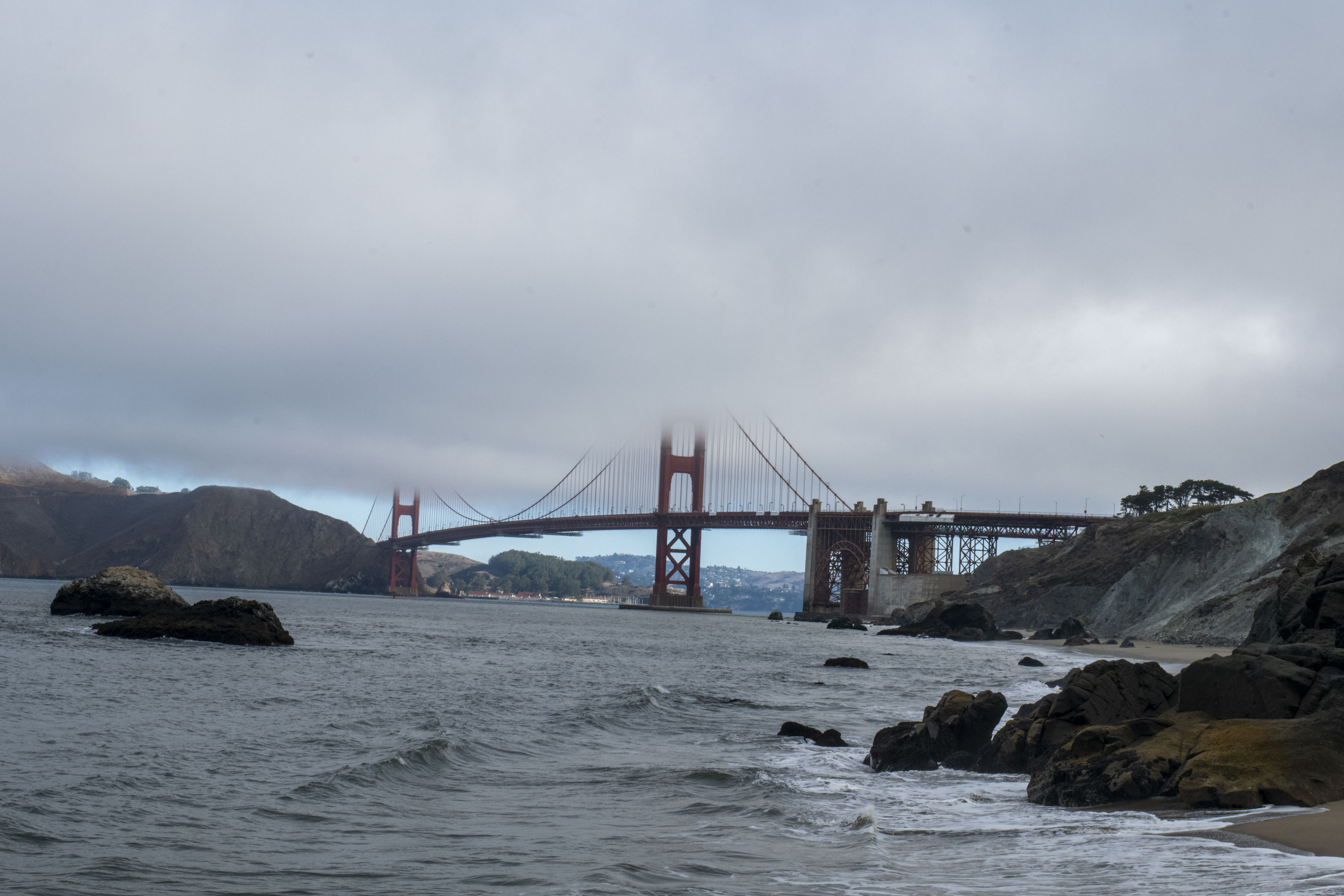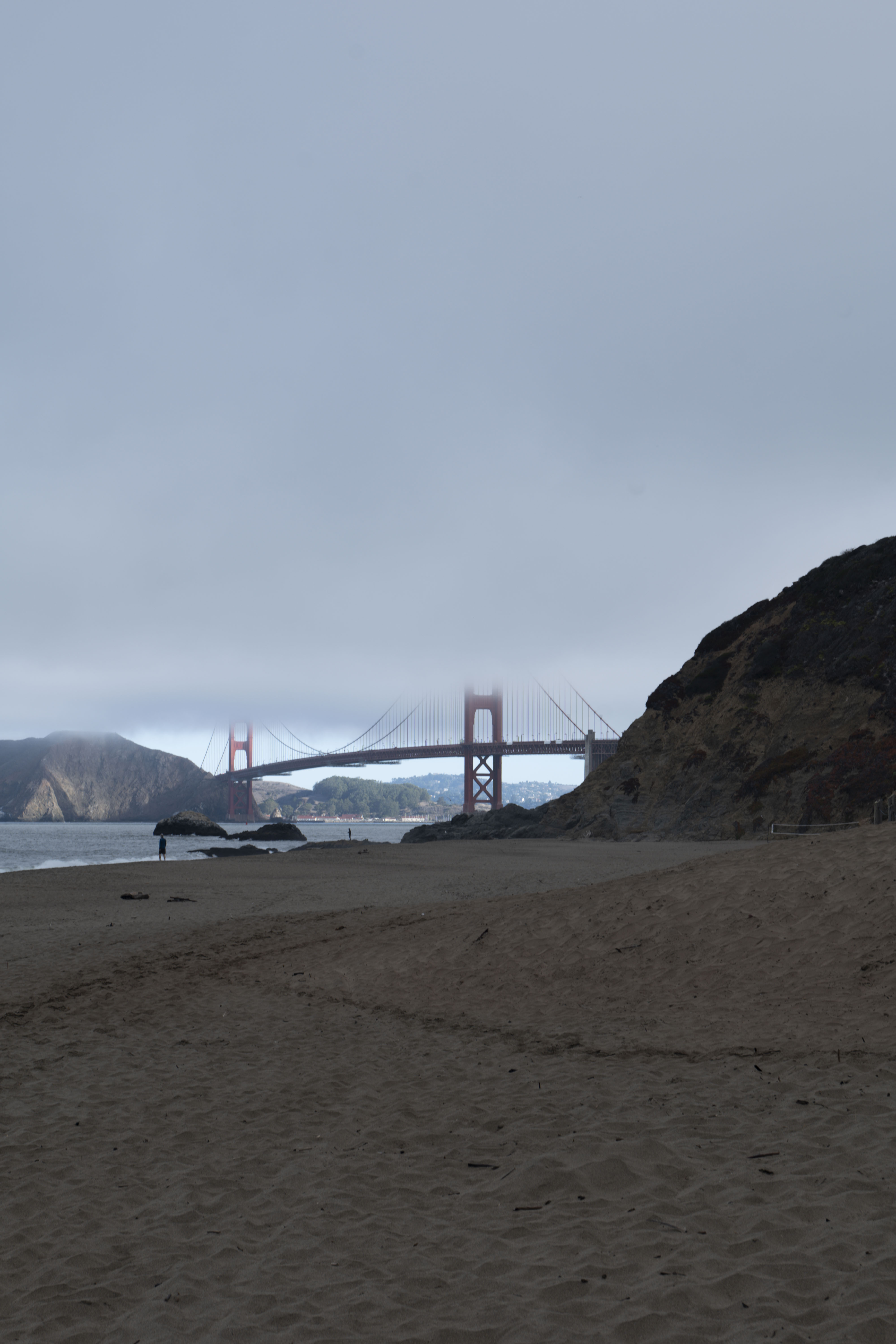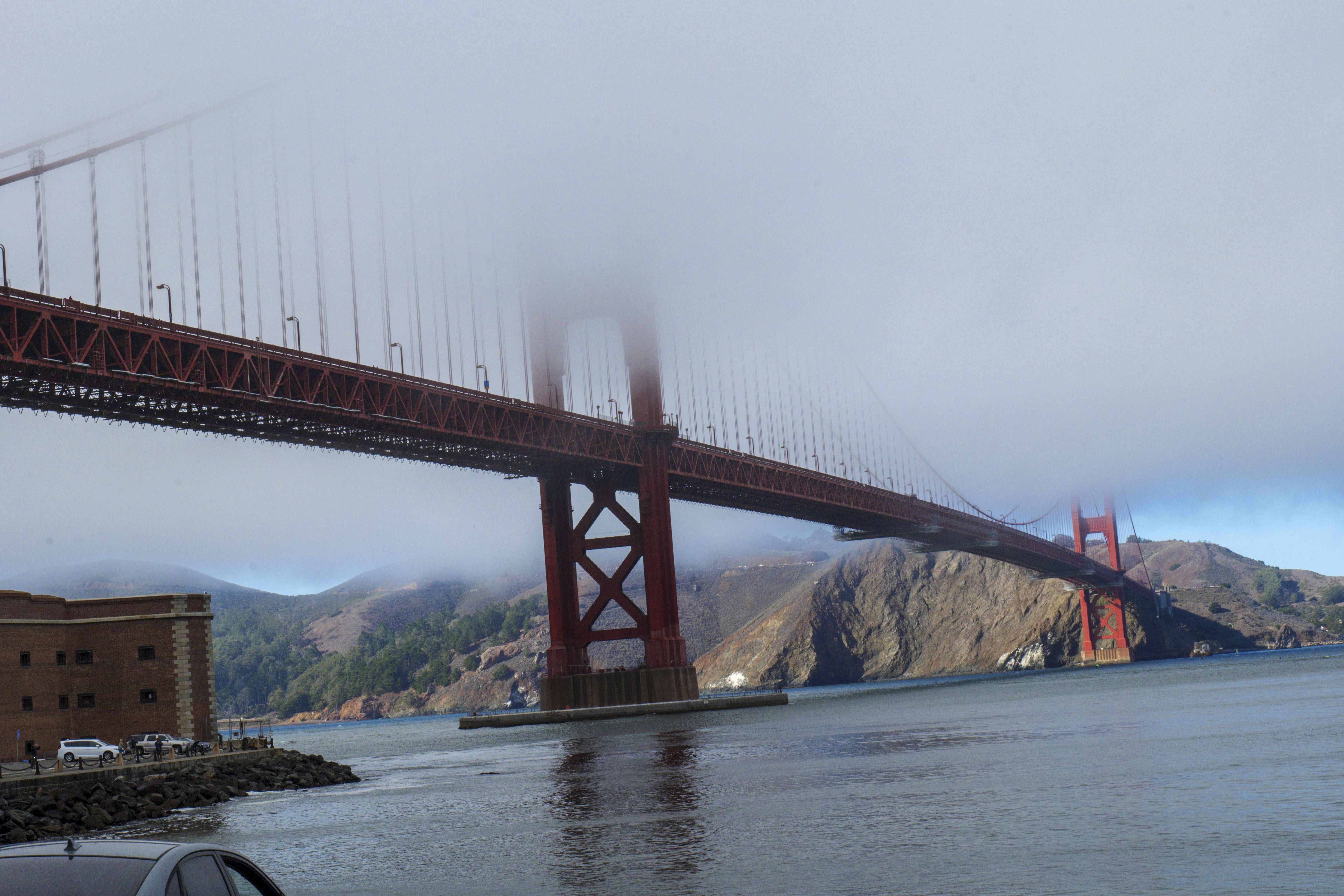 Getting up early meant empty, free car parks by upstream beaches, but the bridge sat in thick cloud. We paid a one-way toll (over $10) to try the opposite side but it was still fogged up. Still worth it, even on a foggy day!