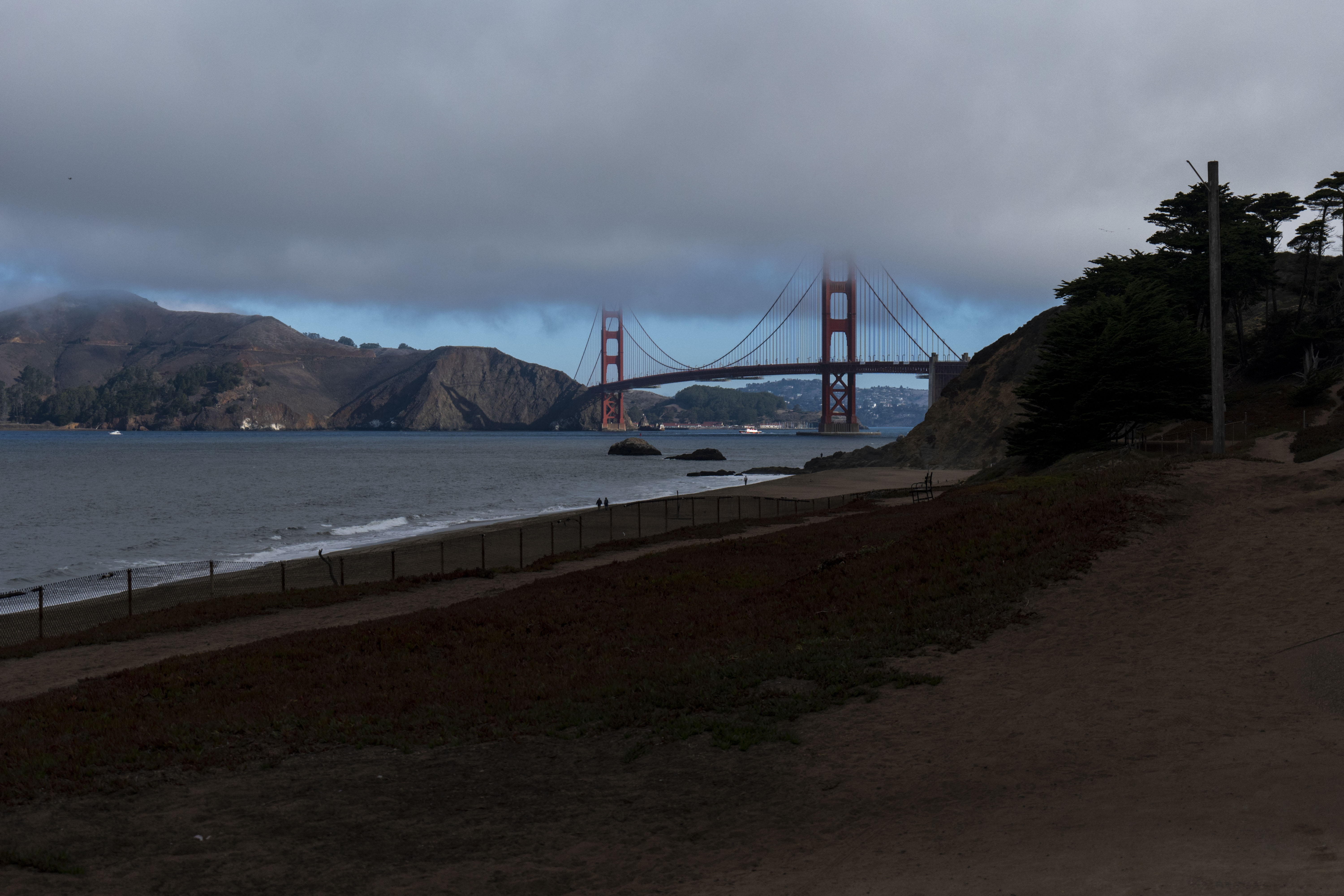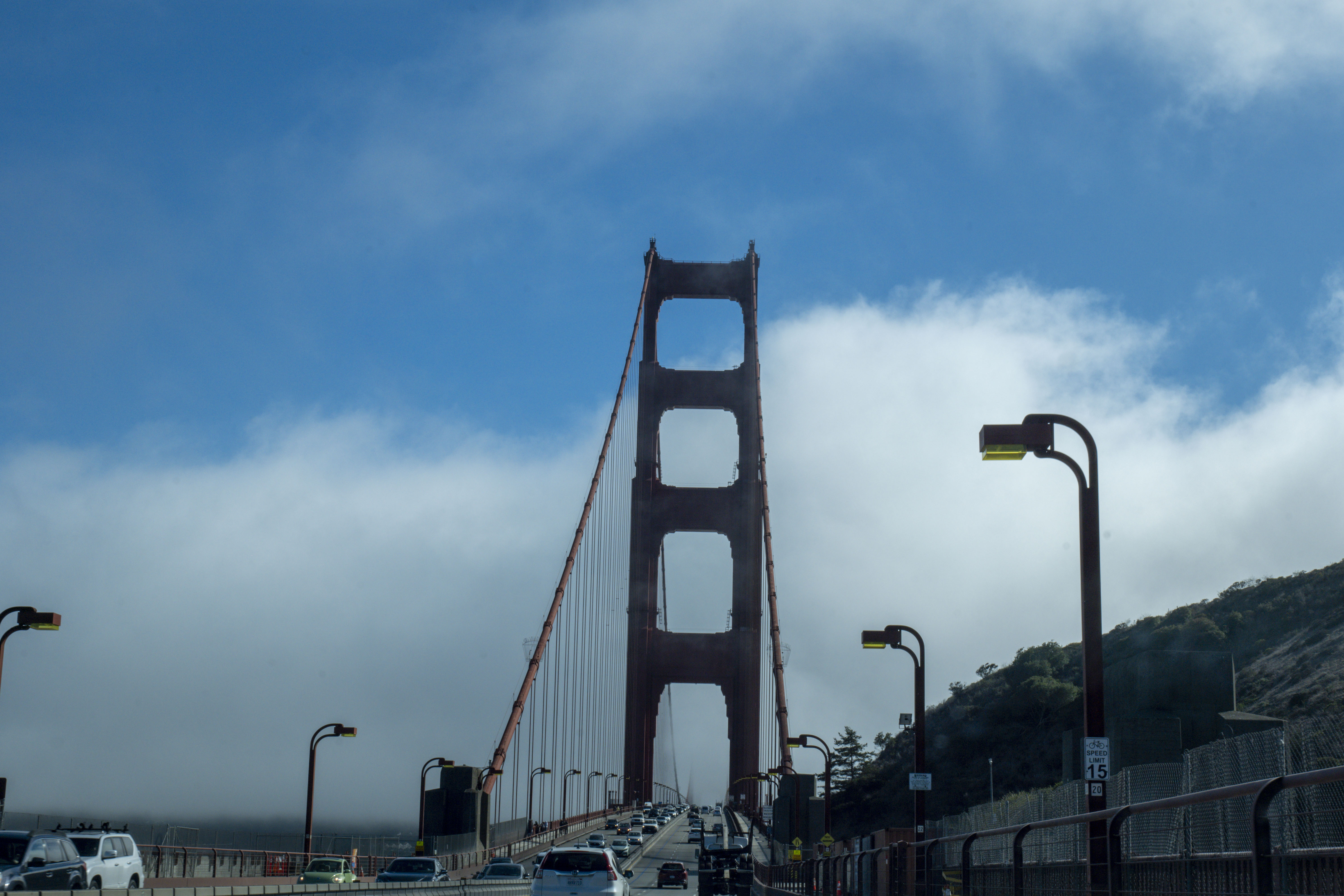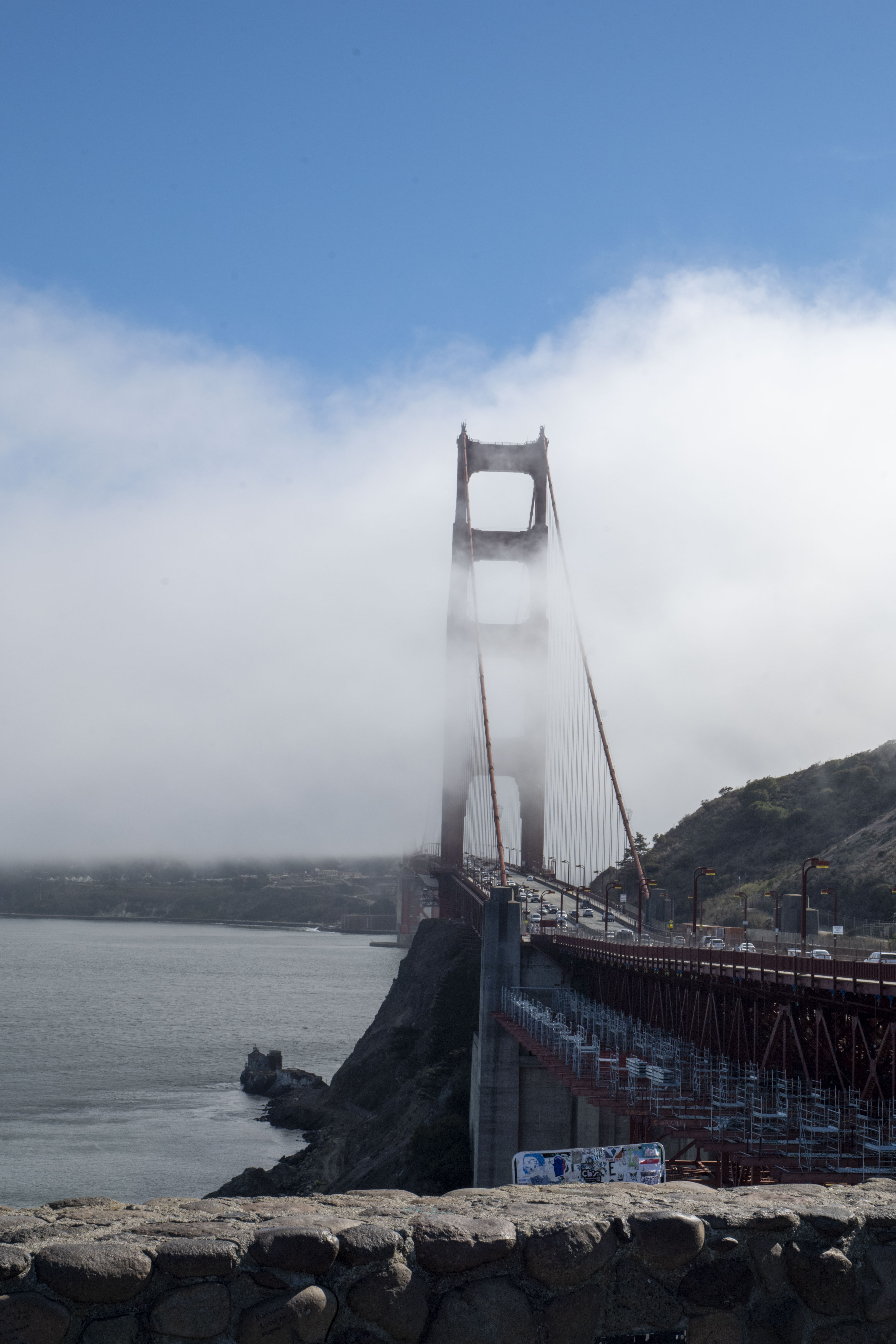 Getting up early meant empty, free car parks by upstream beaches, but the bridge sat in thick cloud. We paid a one-way toll (over $10) to try the opposite side but it was still fogged up. Still worth it, even on a foggy day!